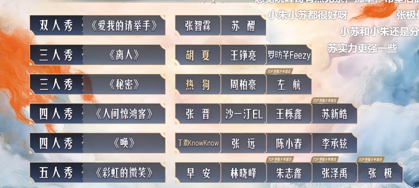 在选择曲目的过程中,我们可以看到心仪的歌曲率先被哥哥们选择,所以张极选择《彩虹的微笑》,但他心心念念想去《离人》,所以放弃滚烫大哥的身份回归自由成员。