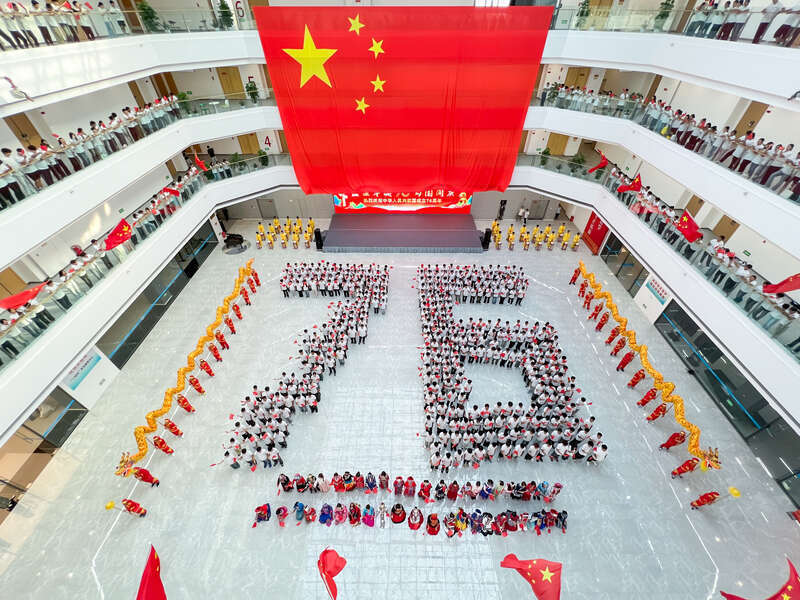 活动现场,一面巨幅五星红旗缓缓展开,与师生手中挥舞的国旗交相辉映。非遗展演《龙腾狮跃贺华诞》,身着56个民族服饰的学子们带来舞蹈《爱我中华》,全场师生合唱《我和我的祖国》,同学们挥舞国旗汇聚成醒目而庄重的“76”字样。